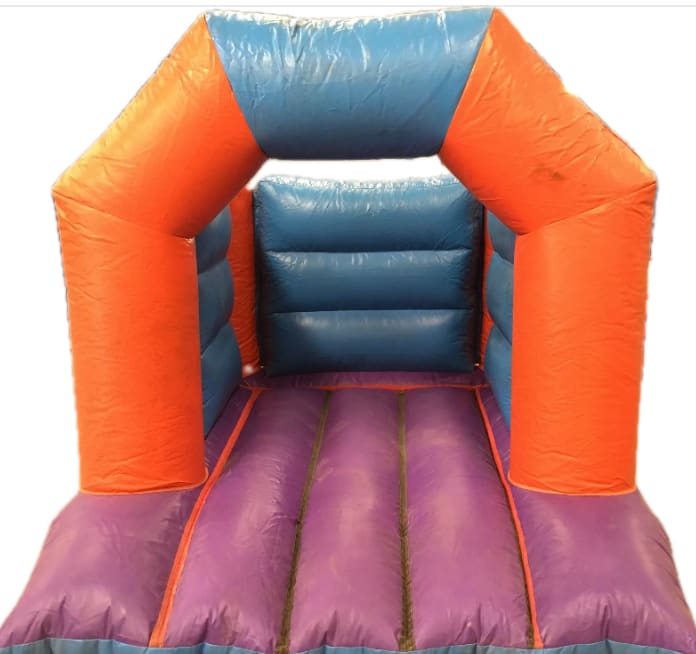 Small bouncy castle hire in vibrant orange, blue and purple colours. This compact inflatable is ideal for younger children and is perfect for smaller gardens or areas where space is limited.